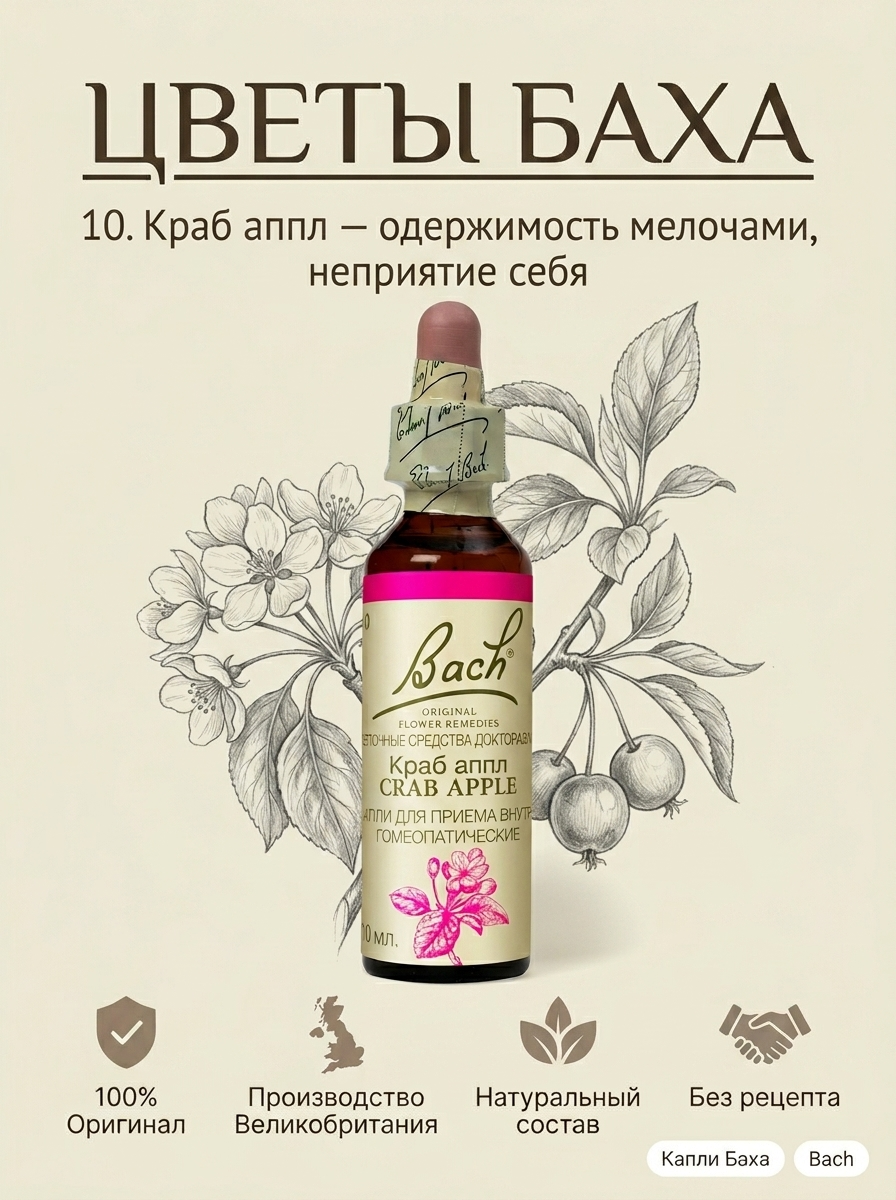 Это очищающее лечебное средство. Рекомендуется излишне педантичным людям, тем, кто отличается болезненной страстью к чистоте и порядку, брезгливостью. Настой из цветков дикой яблони понадобится тому, кто ощущает, что навязчивые мысли начинают управлять его жизнью; тому, кого угнетают мелкие недостатки своей внешности, кто считает себя непривлекательным. Обладая очищающими свойствами, настой из цветков яблони дикой может помочь тем, кто испытывает необходимость в очищении организма после болезни, а также тем, кто считает, что в его организм попал яд или какое-то отравляющее вещество и от него надо избавиться. При этом совсем неважно, относится ли человек к тому типу людей, которым показан настой из цветков яблони дикой. Этот настой поможет всегда, когда присутствует чувство самоосуждения и излишняя озабоченность какими-то мелочами.